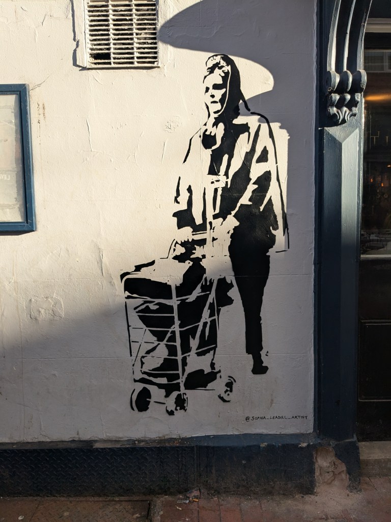 It took around an hour and a half. A lot of that time was spent positioning the stencil and masking off surrounding areas – I’d already done several site visits to scope out the best spot. Once you factor in windows, street lamps, noticeboards and bins, there weren’t many options.