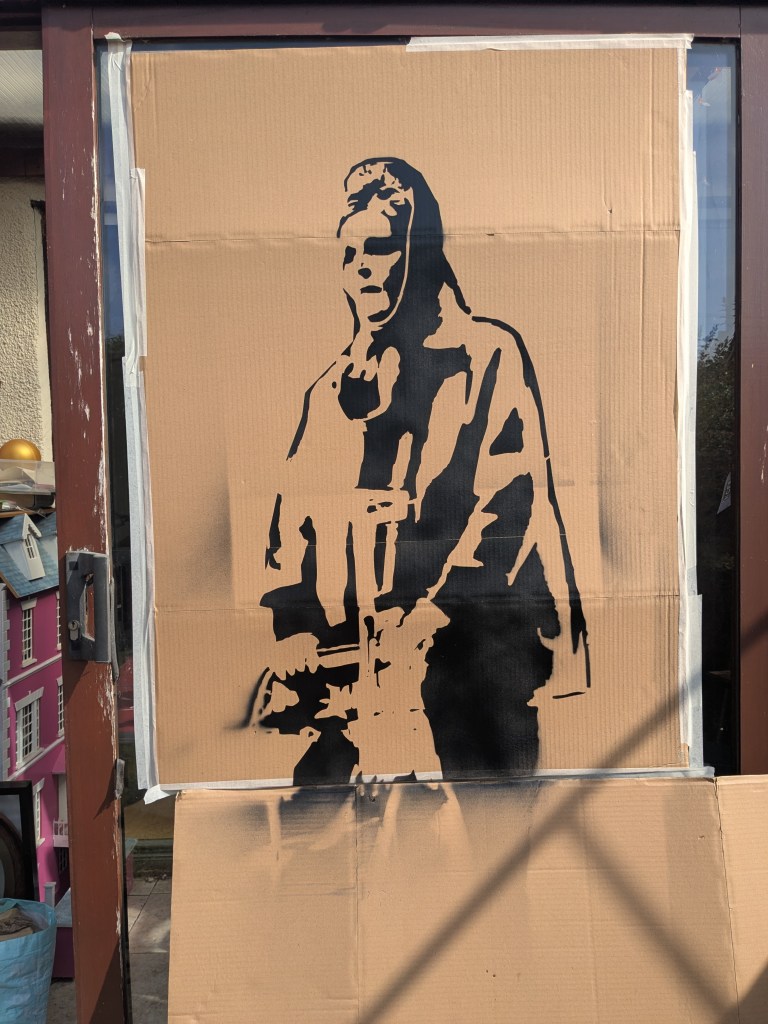 As soon as I started spraying, the filming started. I knew then that my anonymous ‘Banksy in Wrexham’ idea was gone, this’d be all over social media in seconds, and it was. I hadn’t planned to sign it either – it hadn’t occurred to me to do so because the original plan had been for anonymity in any case. I only added a small signature because a staff member really encouraged me to do it, and it was clear that this was already all over social media anyway. Even now that signature is barely visible underneath the painting, and most people probably don’t even see it. I wasn’t very active on social media at the time either, so I totally missed it blowing up on there, although people kept excitedly telling me that this was the case, and responding incredulously when I said I wasn’t really on social media much at the moment, as if I must be mad.
