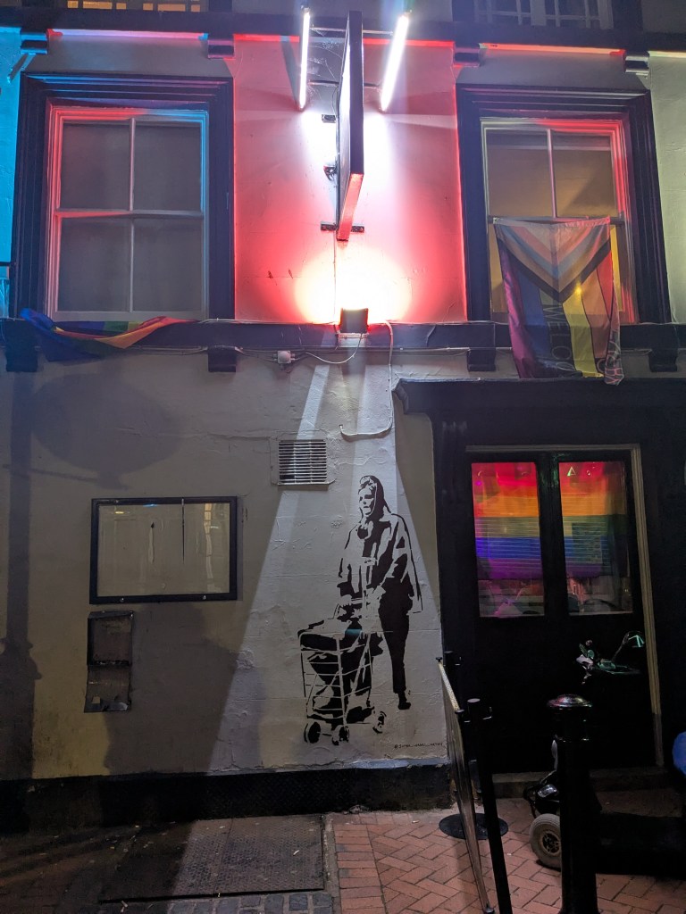 I thought it would be interesting to spray paint June onto the wall in the dead of night on the eve of Wrexham Pride. The Pride parade passes The Long Pull on Saturday morning. I imagined people waking up on the morning of Wrexham Pride to find her there – larger than life, up front and unapologetic in her Big June-ness – and the impact that could have. I was feeling a little playful too – I wondered if local social media might think Banksy had been to Wrexham, and I could visualise the ensuing heated debates on Wrexham Town Matters and Wrexham.Com (if you know you know). Hell, it might even make national news (my mind was off on one at this point).